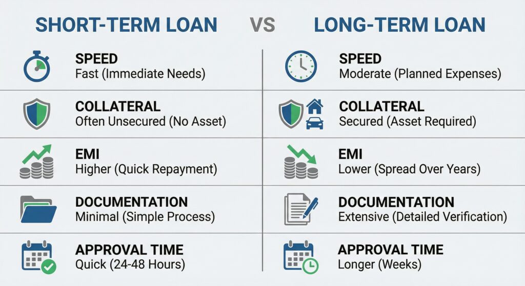 Long-term loans come with lower EMIs because the repayment is spread over years — but the catch is slower approval and more paperwork.